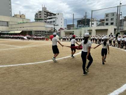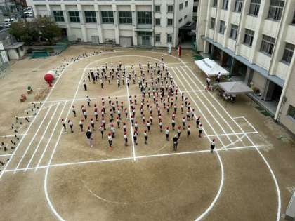 本日の1時間目は、運動会の全体練習をしました。優勝旗、優勝盾、入場、開閉会式、準備体操、整理体操、優勝旗・準優勝盾授与などを幼稚園の園児も参加して行いました。