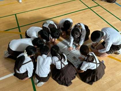 全校児童が、たてわり班ごとに輪になって、新聞記事の中から「あめ、アメ、雨」の単語をたくさん探すゲームをしました。30個以上見つけた班が、4つもありました。みんなで協力して仲良く楽しい時間を過ごすことができました。