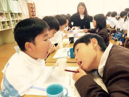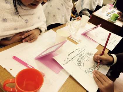 年少のさくら組の園児に、小学校の健康委員会の児童が歯垢染め出しをしてあげました。