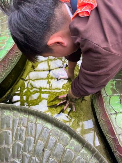 何をしているかというと、ドクターフィッシュの水槽に手を入れて、気持ちよくなっています。