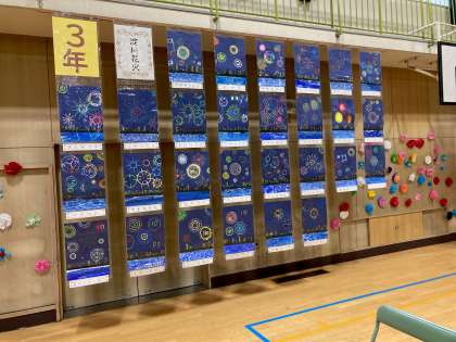 3年生は、お祝いの気持ちを込めて淀川花火大会の様子を描きました。