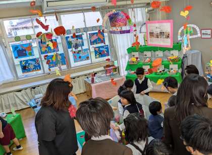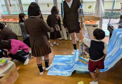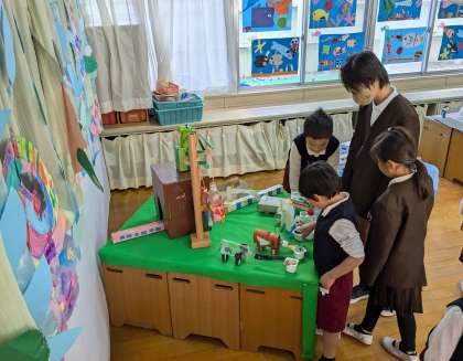 28日(木)、幼稚園の作品展を見せてもらいに行きました。小学生はペアの学年で順番に見に行きました。はじめは1年生と6年生のペアです。説明してもらいながら、大きな作品に入り込んで楽しむ場面もありました。