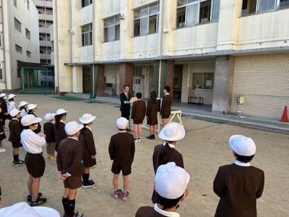 全校朝会で校長先生から6年代表児童が表彰状を受け取りました。