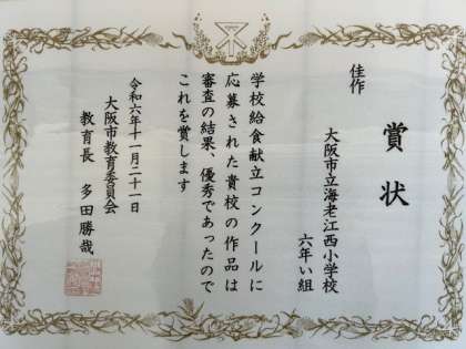 本校の6年い組が、「学校給食献立コンクール」応募に入賞し、佳作の表彰を受けました。応募した献立内容は、