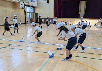 動くおもちゃづくりで、風で動く車を作って楽しみ、動かして楽しみました。それぞれが風を受ける帆を工夫していて、うちわの風を受けてスーッと動いていました。スイスイ走る車を追いかけて、大喜びでした。