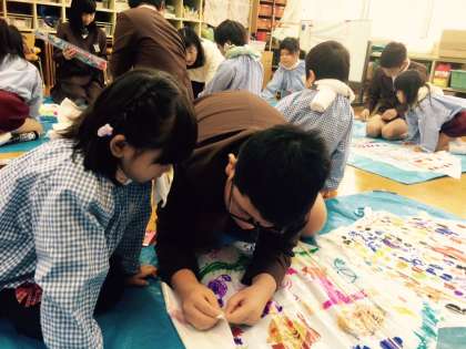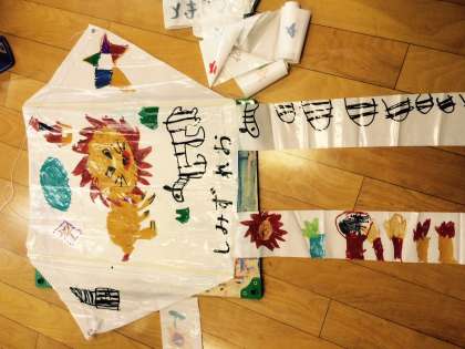 6年生と園児がペアになり、園児が描いた凧にたこ糸をつけるのを6年生が手伝ってくれました。