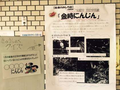 ○ぞう煮に使う野菜の一つ「金時にんじん」は、大阪市東住吉区の畑で作られたにんじんです。なにわの伝統野菜である「金時にんじん」を作っている方は年々少なくなってきましたが、今回、給食に使うために特別にお願いして作っていただいたものです。濃い赤い色で、甘みがあり、美味しくいただきました。