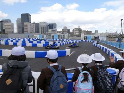 平和学習の後、期間限定で行っている、eメトロ モビリティ タウンへ行って、未来の街づくり、未来の交通について、学習してきました。バーチャル技術を駆使した展示を見たり、空飛ぶ車の構造を解説してもらったりしました。空飛ぶ車の説明には驚くことがたくさんありました。また、楽しい体験ができるコーナーもありました。