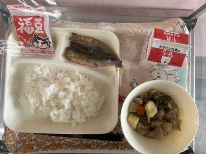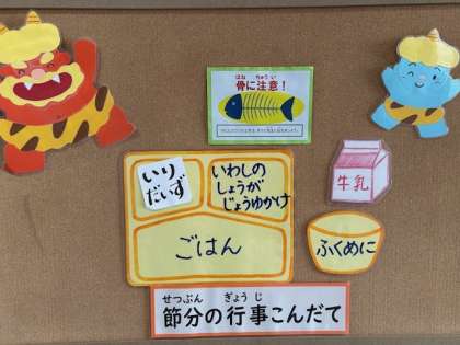 給食では、節分の行事献立として「いわしのしょうがじょううゆかけ」と「いり大豆」が出ます。
