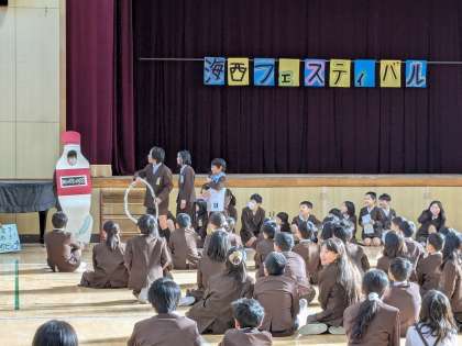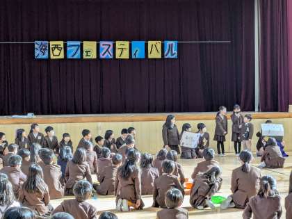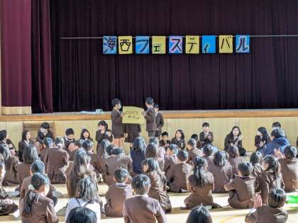 子どもたちが協力して準備してきた『海西フェスティバル』が始まりました。開会式では、児童会代表の開会のあいさつがあって、各班のお店のCMタイムがありました。どの班も工夫していて、とても盛り上がりした。