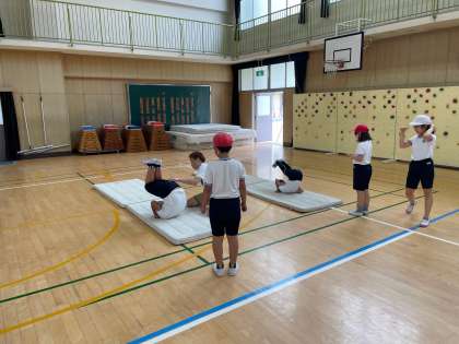 たくさんの先生方にアドバイスを受けながら、3・4年生の子どもたちが、苦手なマット運動にチャレンジしました。今回の課題は「後転」です。手のつき方や、タイミングなど、何か一つでも得るものがあればと思います。みんな、頑張って!