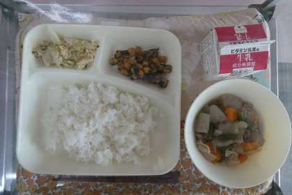 給食のひじき豆は、大豆を油であげ、ふじき、さとう、しょうゆを合わせたたれをからませて作ります。