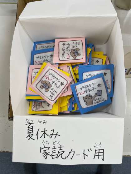 図書委員会では、みんなが本に親しんでもらうために、様々な取り組みをしています。図書室に入ってすぐ目に付くのは、おすすめの本のコーナー。廊下には、おすすめの本の紹介。そして、夏休みに「家読ノート」で15冊以上達成した子どもたちは「プラスワンチケット」がもらえます。子どもたちには夏休みもたくさんの本にふれあい、是非ともプラスワンチケットをゲットしてほしいと思います。