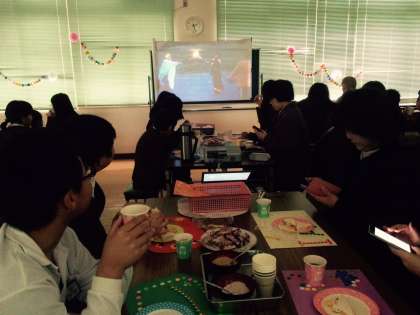 親子で福笑いや百人一首を楽しみ、林間学習のビデオ視聴、合奏も聞いてもらいました。