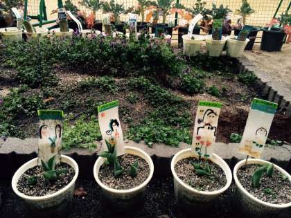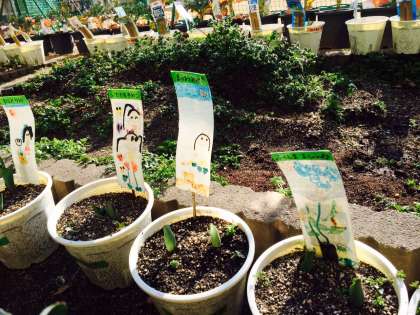 一人一鉢で植えたチューリップの球根の芽が、少しずつ伸びてきました。4月、入園式には色とりどりの花が咲きますように。