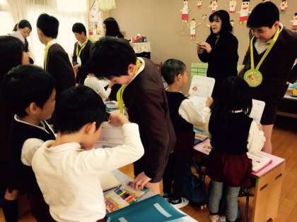 6月から3月まで、月に1回、4時間目終了後、給食準備の時間に、4〜6年生の児童健康委員会の子ども達が、幼稚園の年長まつ組と年少さくら組の歯みがきの仕方を見てあげてきました。
