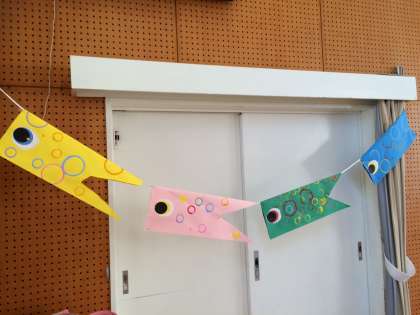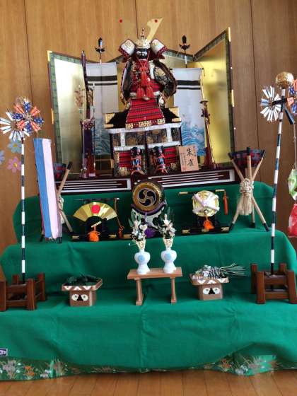幼稚園のプレールームに、五月人形とこいのぼりを飾り、子どもの日のお祝いをしました。