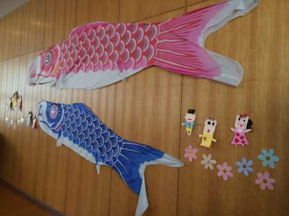 正面には、ジャンボこいのぼり、壁面には園児が作った、かわいいかわいいこいのぼりが飾ってあります。