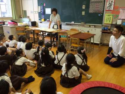 1年生が担任の先生と一緒に、なかよしのクラスで、なかよし担任の先生の話を聞いています。