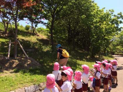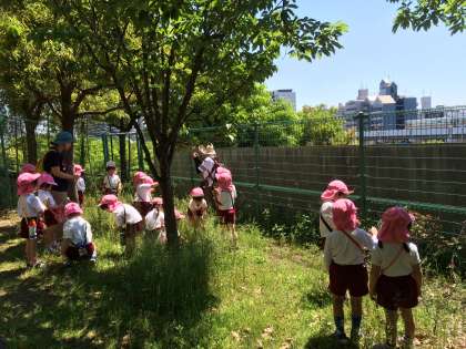 さくら組さんが、春の草花や虫を見つけて遊んでいます。