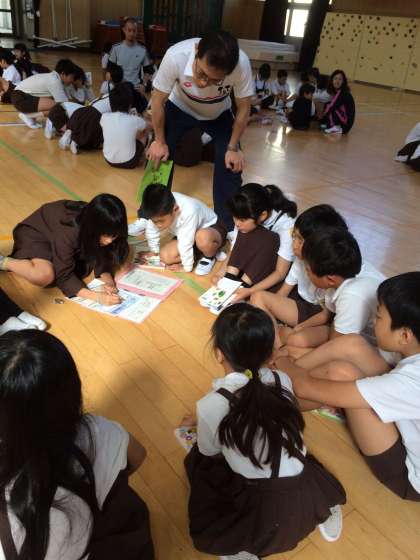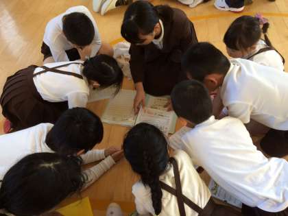 音楽集会が終わると、次は、たてわり清掃の話合いです。掃除のめあてを班で決めました。