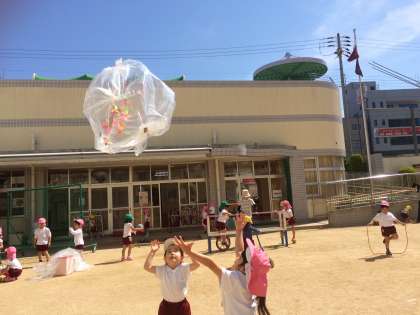 年少のさくら組さんは、とてつもなく大きなビニル袋を両手でポーン、ポーンと、上に飛ばして遊んでいます。