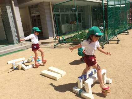 年長のまつ組さんは、1本歯下駄をはいたまま、バランスを崩さず、障害物をまたぎ越していきます。