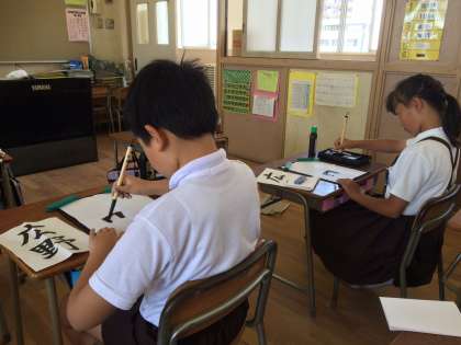 背筋をピンと伸ばし、筆を軽く持って、一筆一筆、集中して書いています。