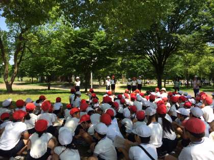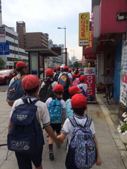 5年生を先頭に、全校遠足に出発!6年生は1年生の手をつないで、安全に気をつけています。