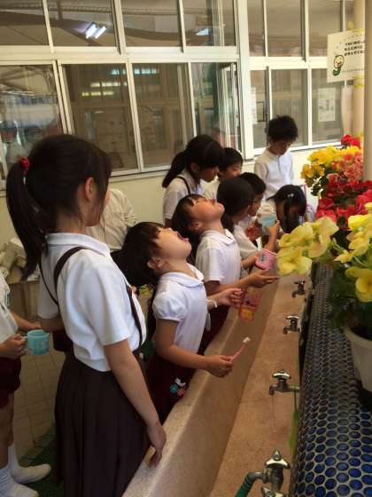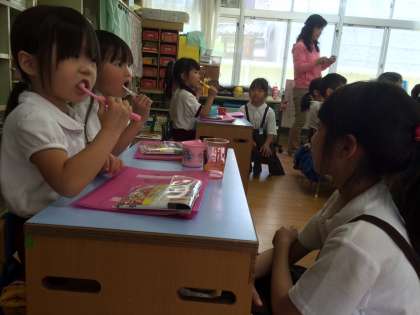 歯みがき、うがい、色塗りと、健康委員会の子ども達がずっと付き添って見てあげています。