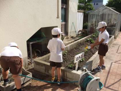 学習園や一人一鉢で育てている野菜の生長を楽しみに、毎日水やりをしている2年生の子ども達。