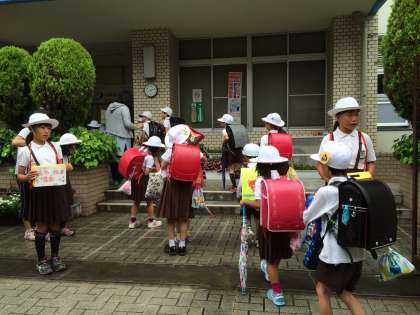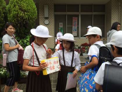 5/30〜6/3まで、朝の登校時間に、玄関で全校児童や教職員に呼びかけました。