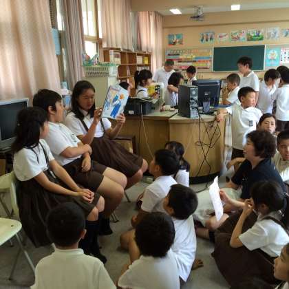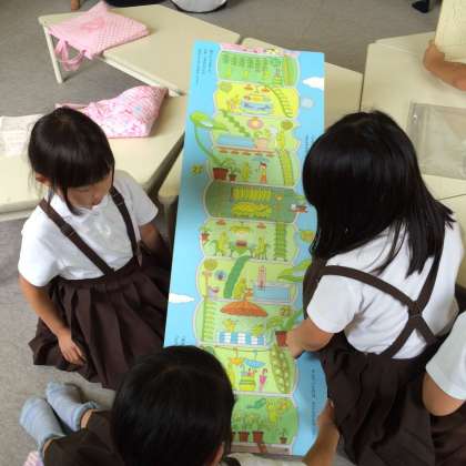大型絵本を見ている子、紙芝居を見ている子、一人で本を読んでいる子など、図書室の中での過ごし方は様々です。