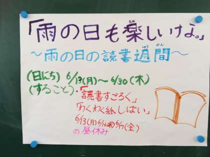 雨の日の読書週間が今日から始まりました。6/13〜6/30までの期間、20分休みと昼休みに図書室が開放されます。