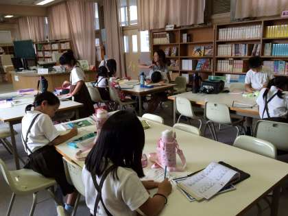 今日は、多目的室で特別支援教育の研修会を行うため、ステップアップ教室の場所を変更して、図書室で行いました。