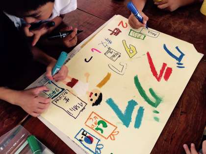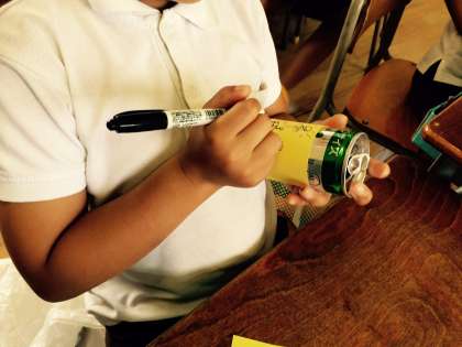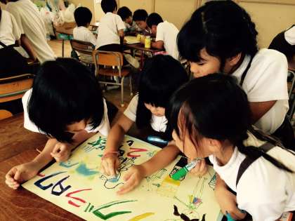 ポスターを友達と一緒に作っている子、空き缶の周りに色画用紙を貼り、ペンで絵を描いている子など、みな、集中して活動しています。