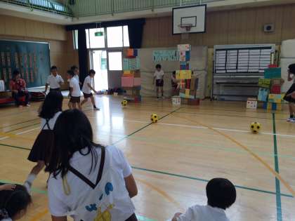 ボールをけって、積み上げた箱を倒します。3回けって、倒した箱の合計は?