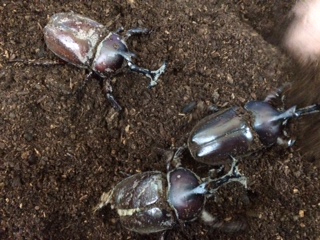 以前、他校の校長先生から、たくさんいただいた幼虫が、こんなに大きくなりました。オスとメスが仲良く暮らしています。