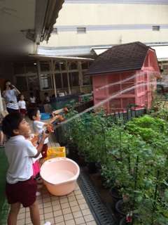 7月は、暑い中での遊びですので、屋上で水遊び、裏庭で砂場遊び、保育室でブロックやお店やさんごっこ、プラレールなどを計画していました。
