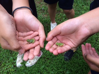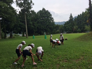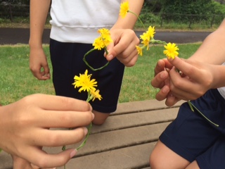 アスレチックを満喫した子ども達は、カエルやバッタを探したり、花の首飾りを作ったりして、ゆっくりと過ごしています。