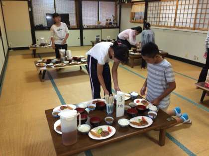 食事係が夕飯の準備をしています。みんなのご飯とお茶をよそい、食卓にご飯が左、味噌汁を左、主菜を中央に配膳しました。