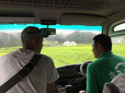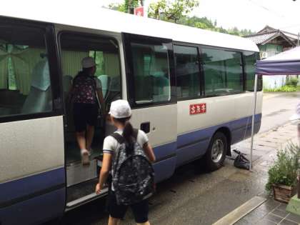 雨のため、高原亭さんのマイクロバスに乗って神鍋高原体育館へ移動しました。