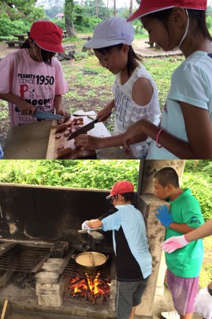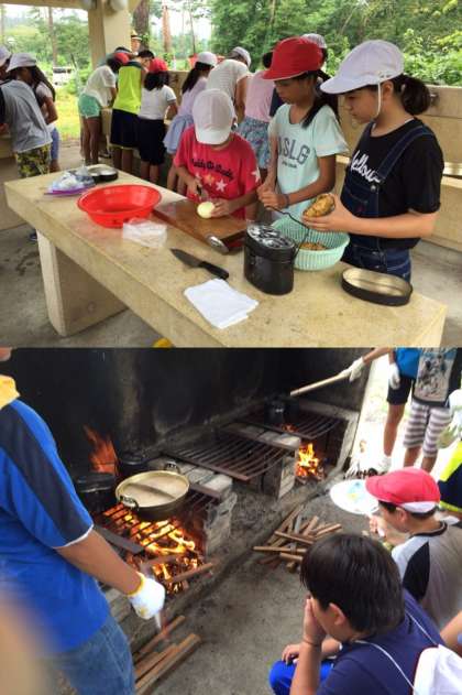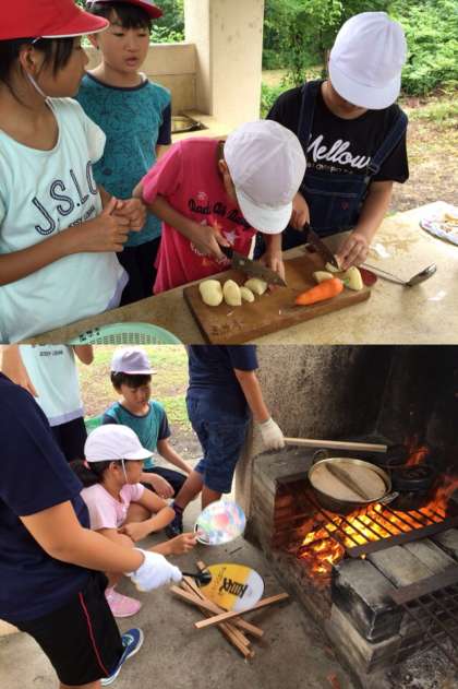 火おこしグループと野菜と肉を切るグループに分かれ、みんなで協力してお昼ご飯をつくっています。