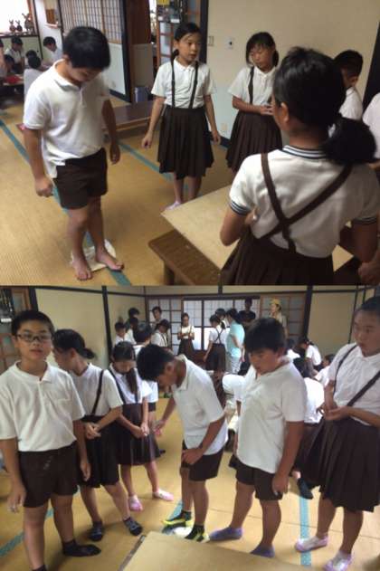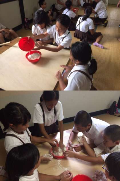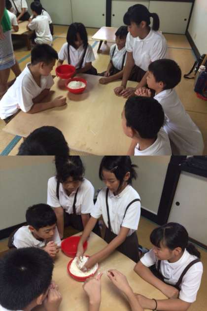 生地ができたら、ビニル袋に入れて足で踏みます。コシのあるうどんになあれ!