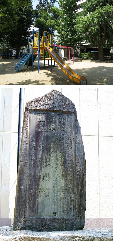 海老江中公園に歴史を感じさせる立派な石碑があるのを発見しました。帰校して調べてみると、「淀川改修記念碑」でした。