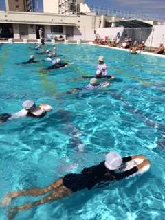 フープの中をくぐったり、わっかを足にはめたり、けのびをしたり。場の設定を工夫されていたので、それぞれのコーナーで、同じグループの友達と一緒に水遊びを楽しんでいました。伏し浮きも上手になってきました!