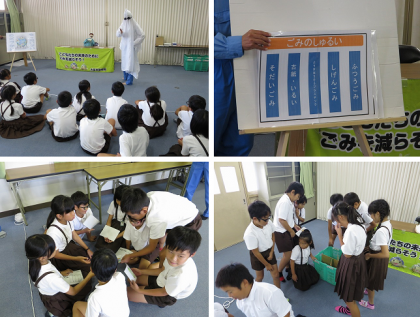 まずは多目的室で、ごみの分別や資源の大切さを学びました。学習した後はクイズ。班の友だちと協力して、いくつかのゴミをどのゴミに分別するか考えました。