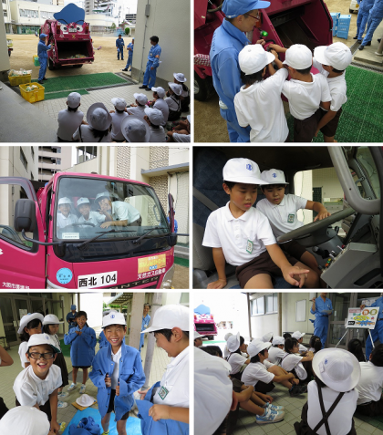 続いて、運動場でパッカー車に模擬ごみを投入しました。乗車体験やパッカー車についてのクイズ、ペットボトルをリサイクルしてできた作業着も着ました。