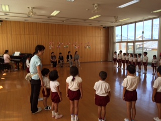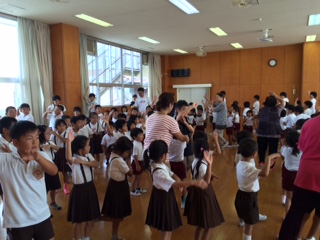 幼稚園の年長と年少、小学校1・2年生、集会委員の子ども達が、幼稚園のプレイルームで踊りました。