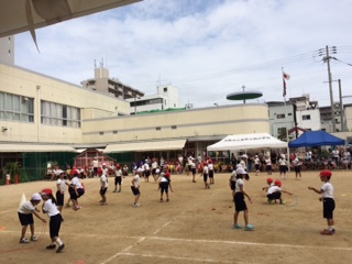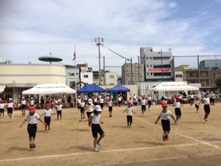 フィンガー5の「学園天国」の曲にのって、子どもたちは、かけ足とび、1人とび、1・2年で縦割りペアをつくり、2人とびなど、練習してきた成果を発揮しました。